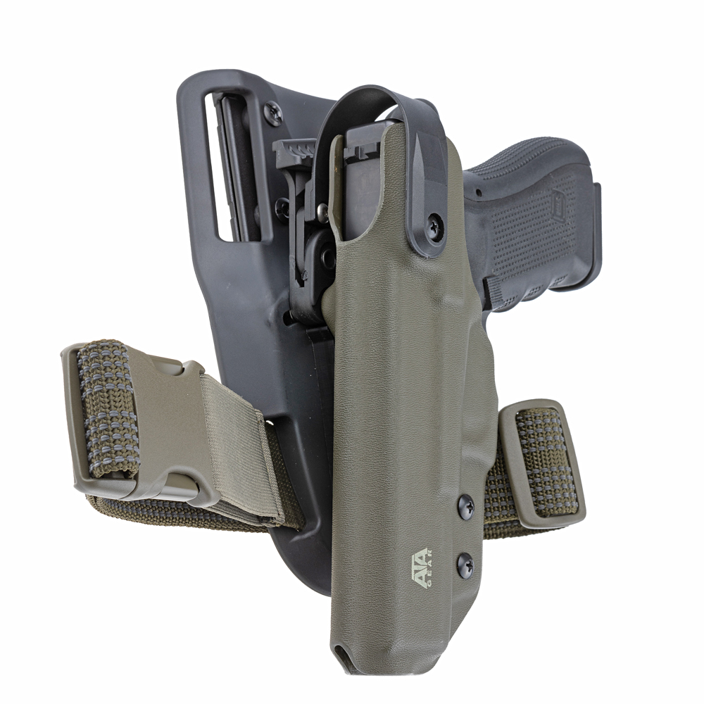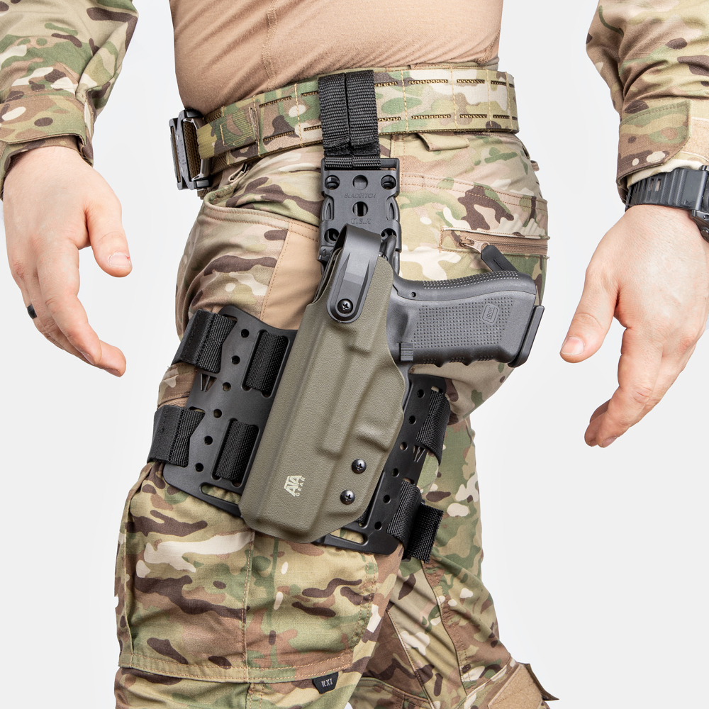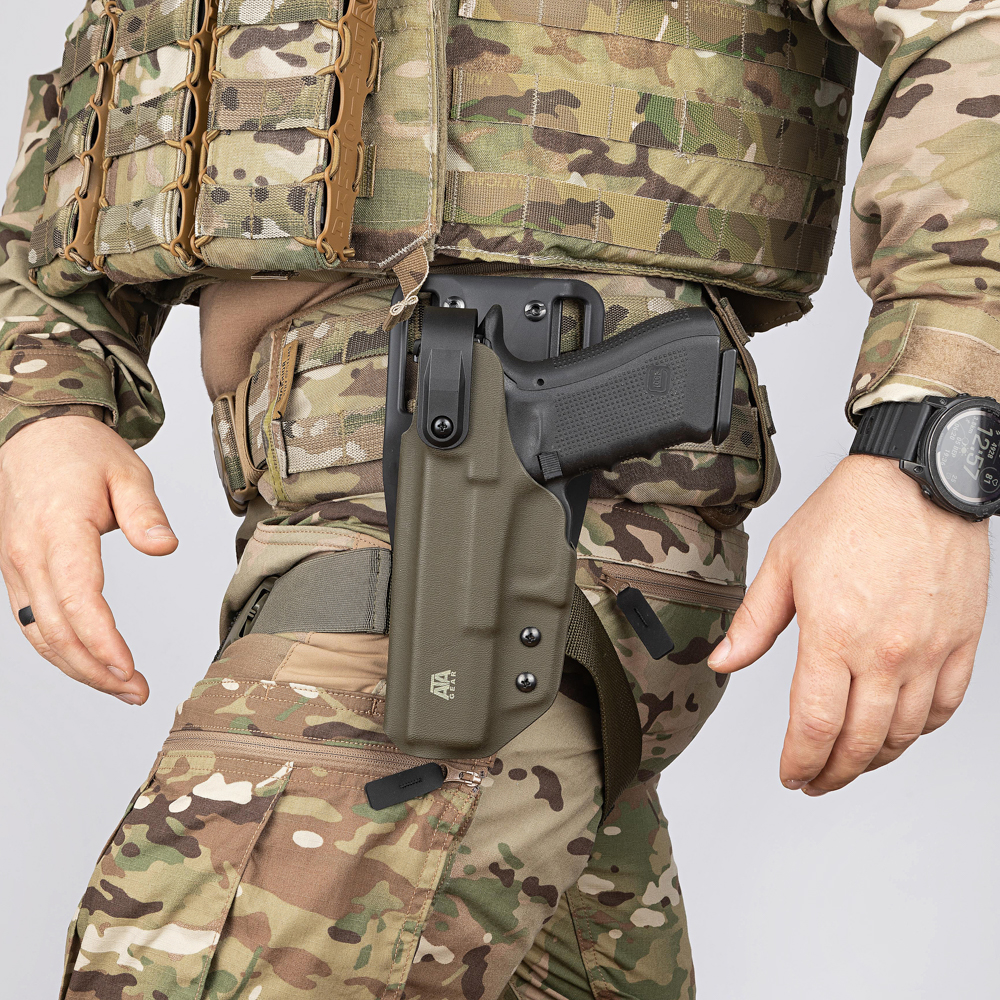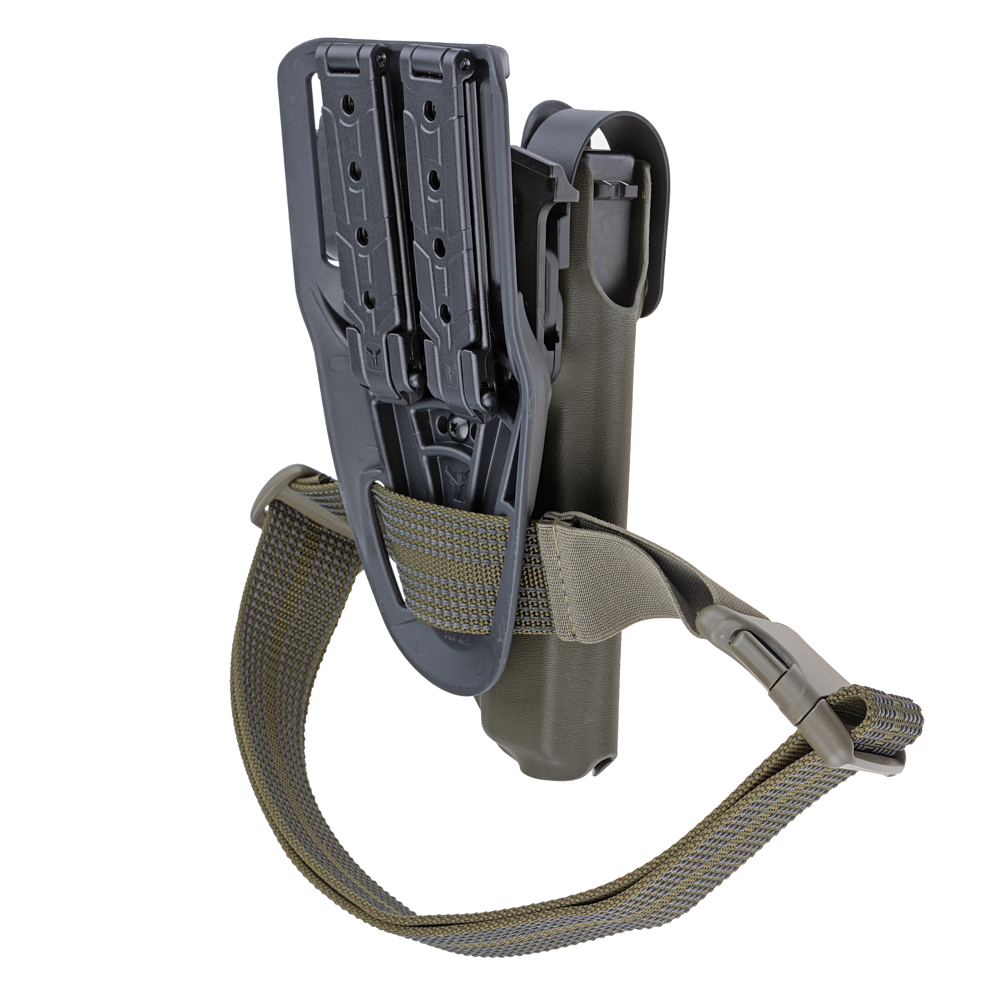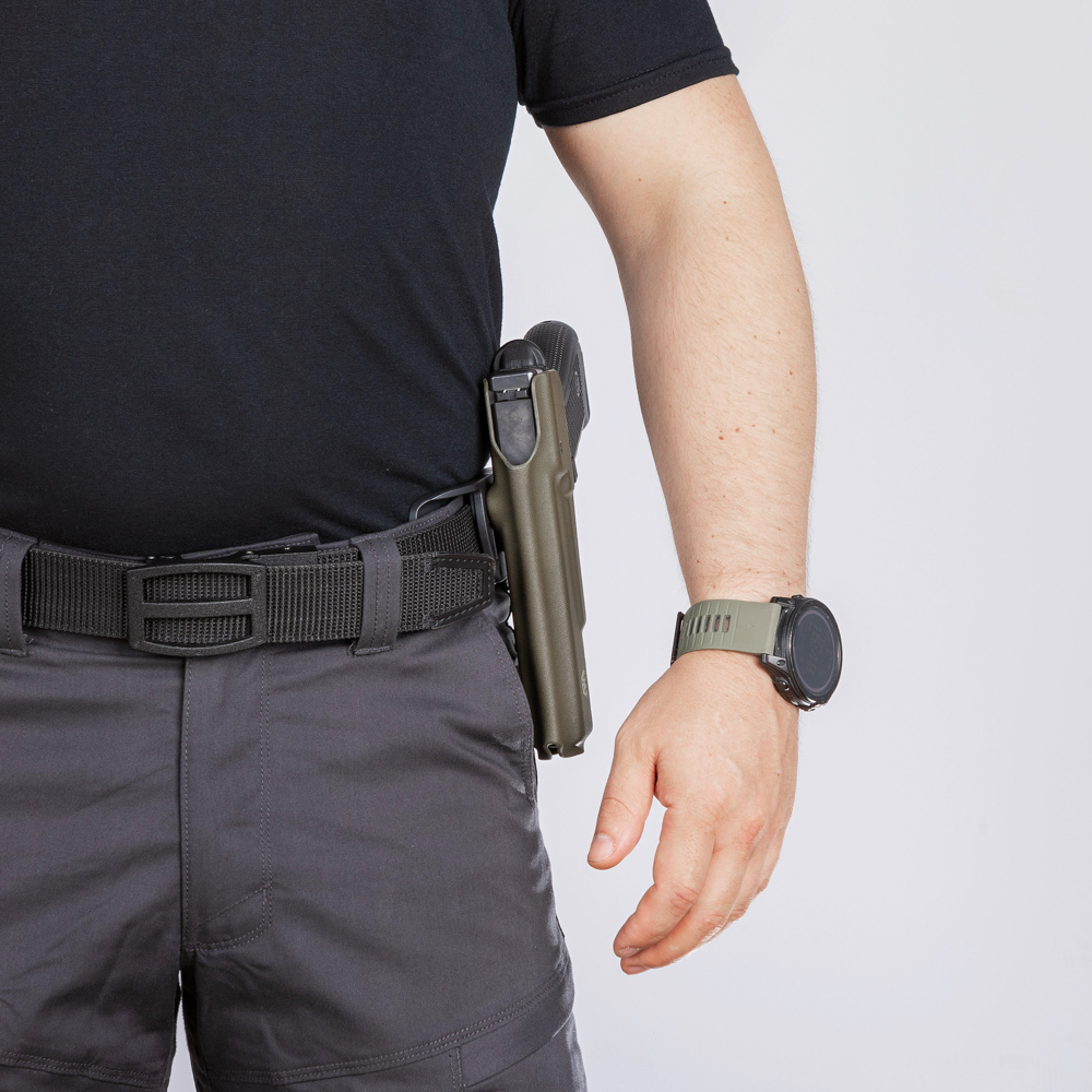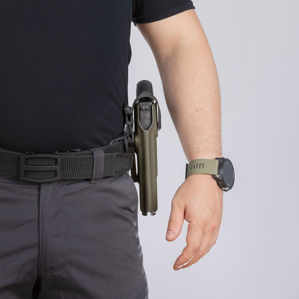 ON Duty holsters are specially designed for military and special police units. A feature of this model is its versatility. Shooter, based on the set in front of him tasks and using additional accessories, can easily place a holster on his belt with the help of a belt fastening or a special belt clip of the “paddle” type, lower this holster for convenience of pulling out the handgun, and also attach it to the warrior belt, plate carrier interface at an angle of 90 degrees or attach to the hip platform. For the convenience of changing position of the handgun provides the installation of a quick-detachable holster mount. The advantage of holsters which undoubtedly will appreciate special forces, since on the molle system, the holster mount takes up only two rows of slings and frees up an extra space for other accessories on the molle.